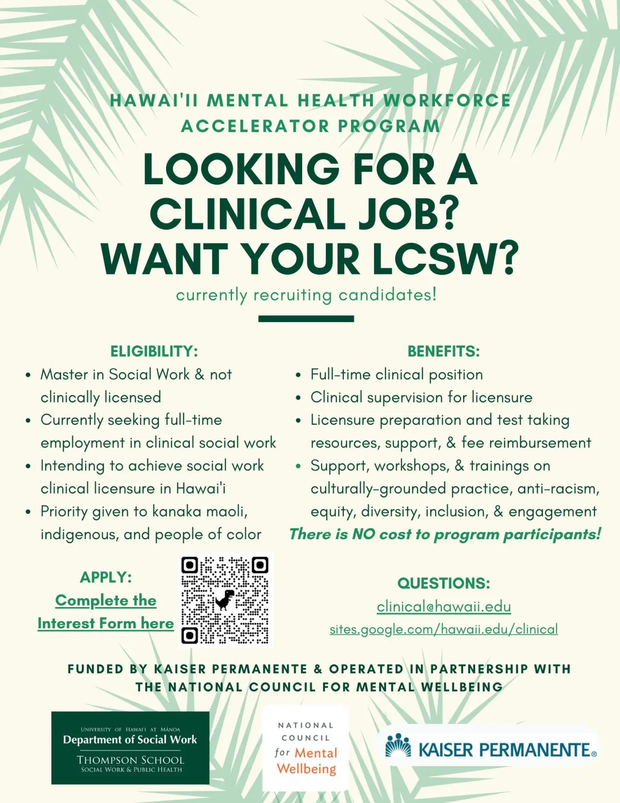 If getting your clinical license in Hawaiʻi is your goal, the Hawaiʻi Mental Health Workforce Accelerator is your answer! A new grant-funded project at the UHM Thompson School, Department of Social Work is committed to increase the number of diverse licensed clinicians in the state of Hawaiʻi. Along with partners, Kaiser Permanente and the National Council for Mental Wellbeing, the shared goal is to ensure our behavioral health workforce reflects our uniquely diverse communities. UHM is currently accepting applications for candidates who want to get their LCSW, LMFT, or LMHC for upcoming cohorts (July 2024 and January 2025). Visit their site for the current application form and FAQ page.