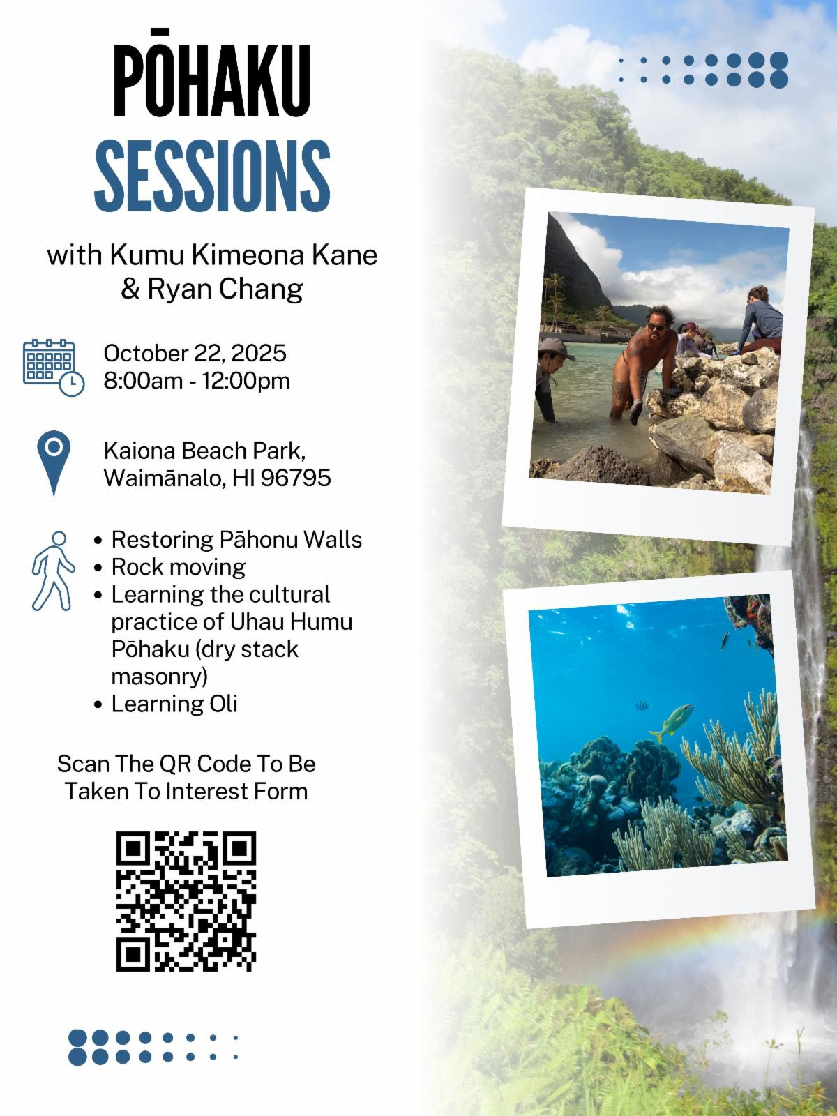 In collaboration with the Waimānalo Limu Hui and Protect and Preserve Hawaii, attendees will help to restore and maintain the rock walls of Pāhonu by collecting, relocating, and fitting rocks rocks together under the tutelage of Kumu Kimeona Kane and Ryan Chang. As this is the only known structure of its kind in the Hawaiian Islands, attendees’ time and efforts will have a meaningful impact on ensuring Pāhonu is stewarded for future generations. We envision this event to be an opportunity to connect authentically with a very special place and to allow for time to have fun and connect among our Hawaii mental health ohana.